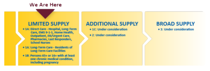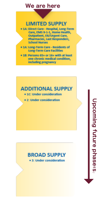 Front-line healthcare workers and residents at long-term care facilities (called Phase 1A) plus people over 65 or with a chronic medical condition that puts them at increased risk for severe illness from COVID‐19 (called Phase 1B) are currently eligible to receive the COVID‐19 vaccine.